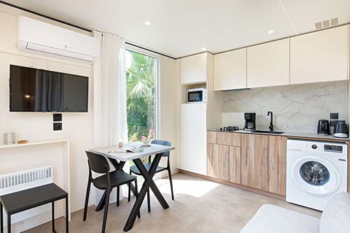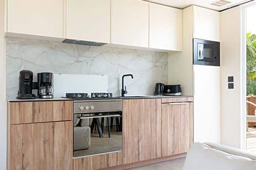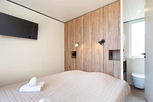 Een lichte, moderne en ruime leefruimte met twee slaapkamers, elk met een eigen badkamer – waarvan één suite met tweepersoonsbed. Het biedt ongeëvenaard comfort in de wereld van outdoor hotels. De grote schuifpui met vier panelen zorgt voor een perfecte overgang tussen binnen en buiten, zodat u volop kunt genieten van de natuurlijke omgeving.